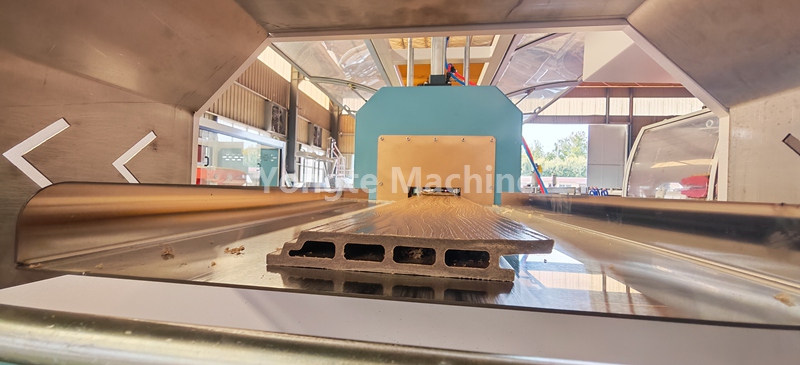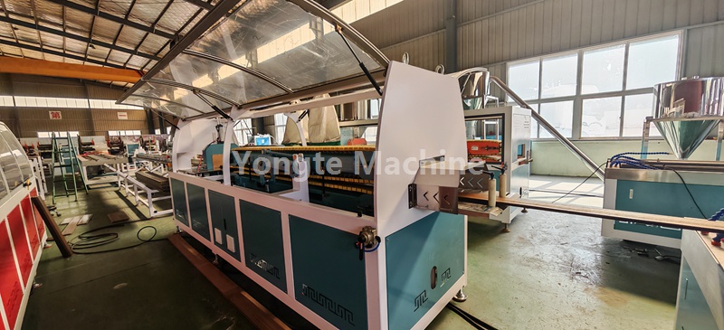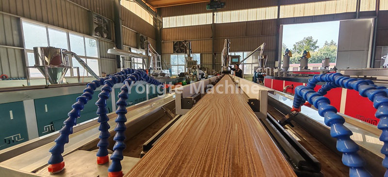 Эта линия экструзии профиля ДПК оснащена автоматической системой вакуумной подачи, высокоэффективной конической двухшнековой экструзионной системой, системой управления ПЛК, онлайн-машиной для 3D-тиснения, водяным и вакуумным охлаждением и калибровочным столом, двойным гусеничным транспортером, автоматическим отрезным станком с пылесборником и укладчиком продукции.