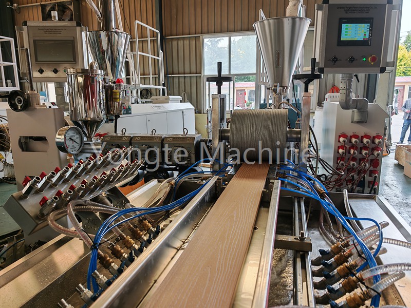 Линия экструзии профиля WPC Yongte, oПроизводительность увеличилась на 15–20% по сравнению со стандартными линиями экструзии ДПК. это действительно основное оборудование всей производственной линии. Эта линия включает в себя высокоэффективный конический двухшнековый экструдер,Формы для профилей ДПК, калибровочный и охлаждающий стол, тяговый и отрезной станок, автоматическая электрическая система управления.